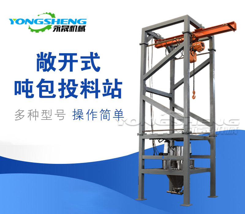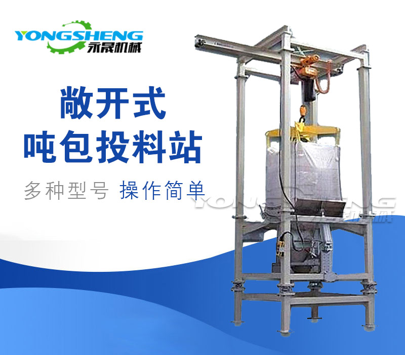 噸袋拆包機(jī)用來實(shí)現(xiàn)袋裝散裝物料的卸料功能,為半自動操作。包裝袋由電動葫蘆提升,包裝袋的袋繩掛在鋼性支架上,手動操作控制葫蘆升降和行走,沿著行走導(dǎo)軌運(yùn)行到卸料區(qū)上方落下,將包裝袋放置在支架托盤上,使大袋處于卸料位置。然后手動打開卸料閥操作門,人工將包裝袋的卸料口拉入到卸料閥的系口出,按下系帶按鈕,卸料閥束緊氣缸將袋口鎖緊,再手動將大袋的卸料口從卸料位置拉下,罩在卸料口密封箱內(nèi)的出料管外側(cè),按下壓袋機(jī)構(gòu)氣動控制開關(guān),使密封法蘭下降,并緊壓在出料管的管端,密封卸料通道,以防卸料過程中粉塵漏,接著,人工解袋,后,關(guān)上操作門。手動開啟與卸料口密封箱連接的通風(fēng)除塵管道上的閥門。至此,卸料準(zhǔn)備過程結(jié)束。